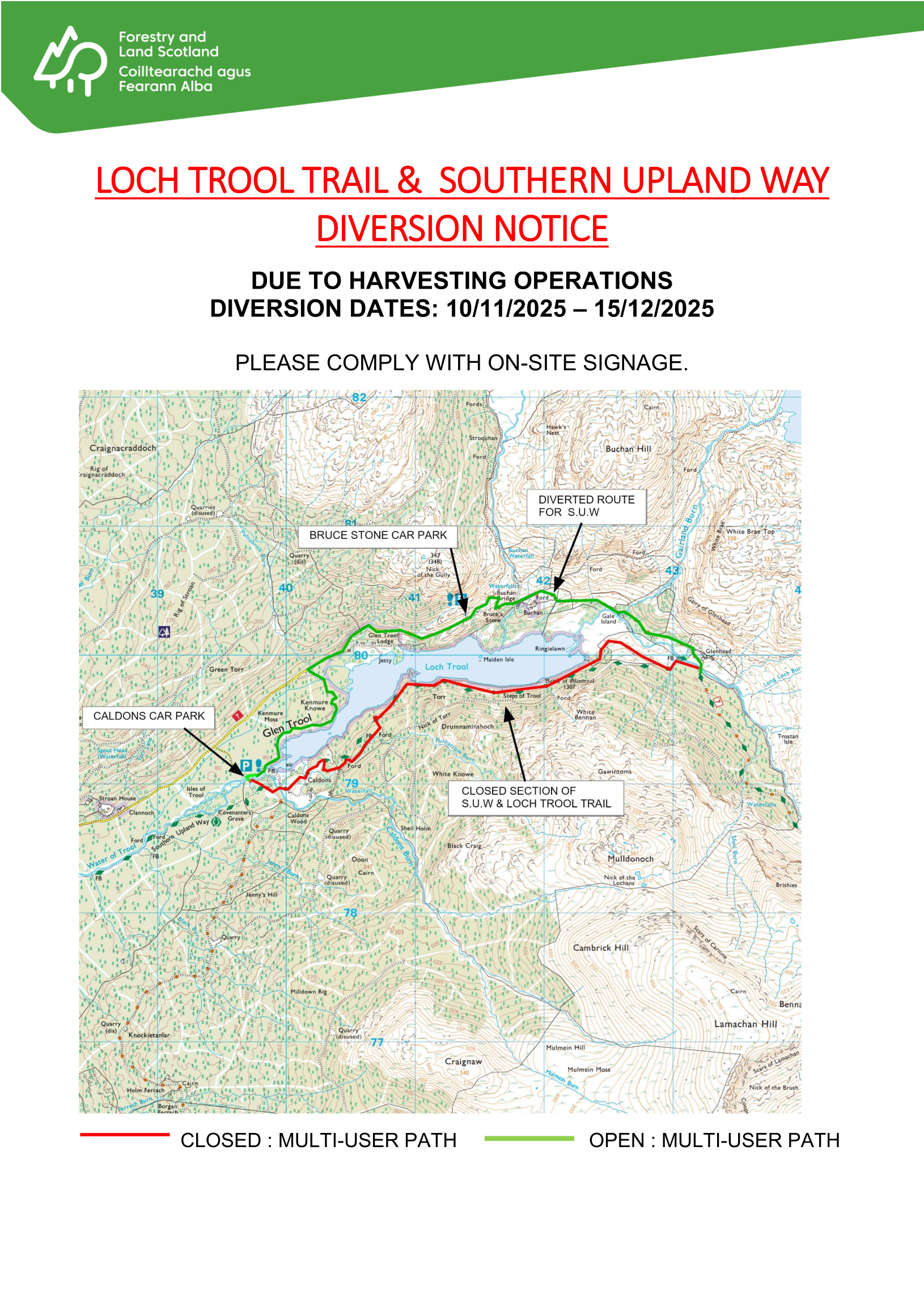 October 3, 2025Due to harvesting operations the section of the Southern Upland Way alongside Loch Trool is being closed from the 10th November to the 15th December 2025. This may be extended depending on weather conditions over the next month.